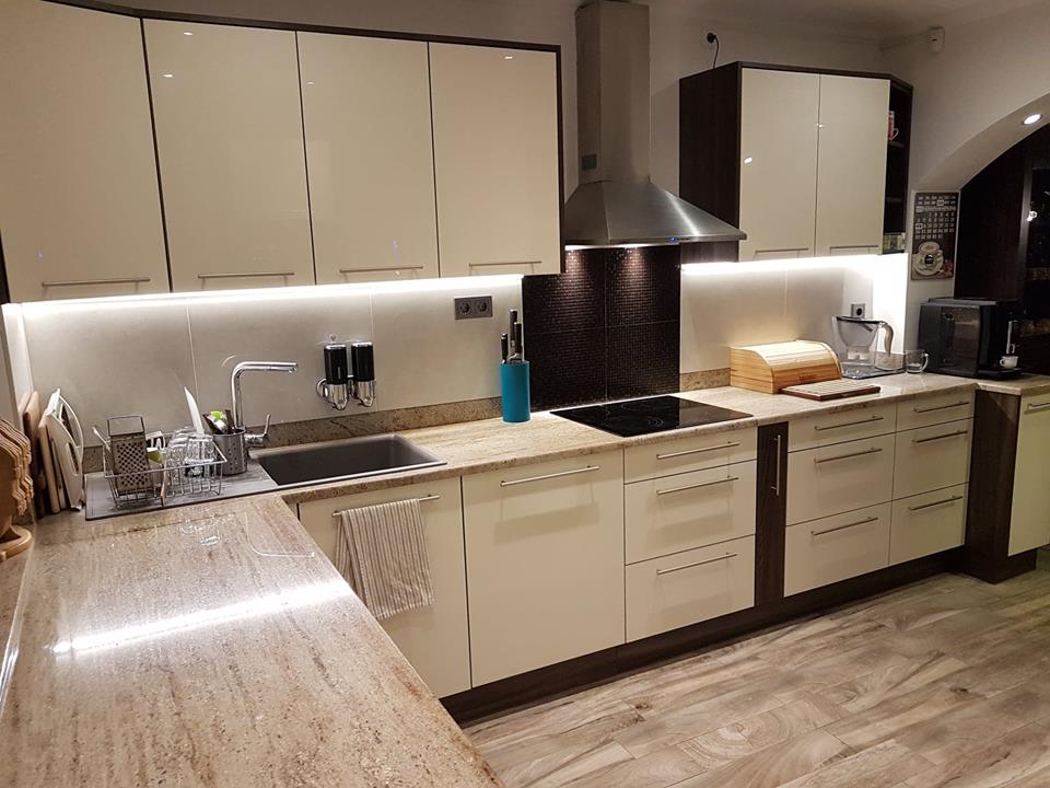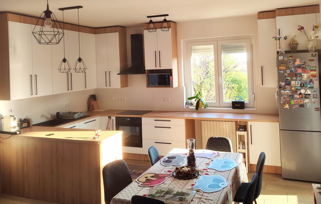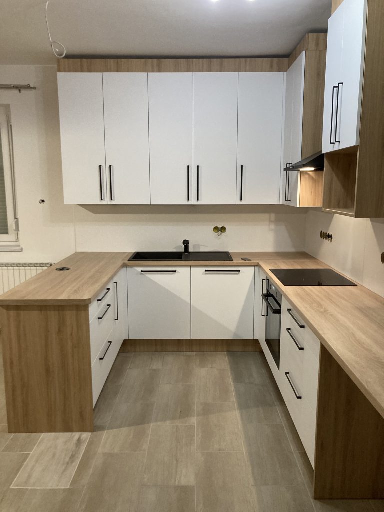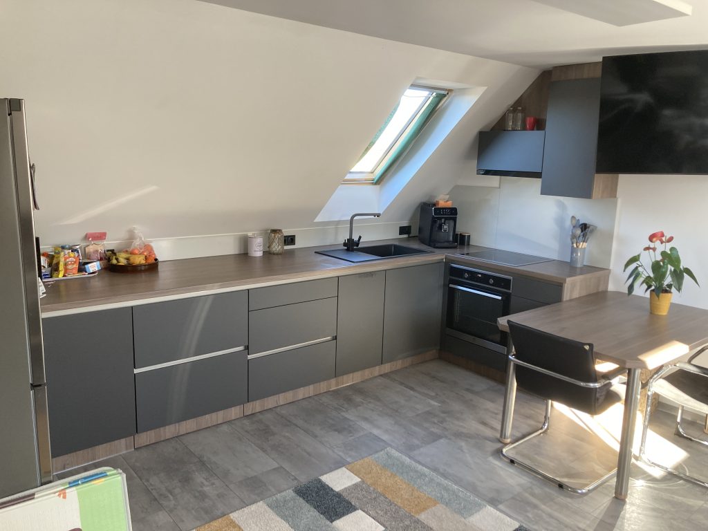 Schwarzmatte Griffe, integrierte Steckdose, Granitspüle und Armatur – selbstverständlich alles fachgerecht angeschlossen.