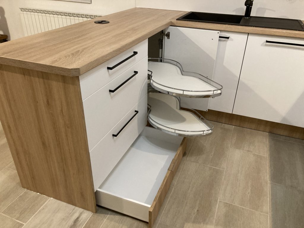Eckschranklösung mit Magic Corner sowie Sockelladen sorgen für eine clevere Raumnutzung.