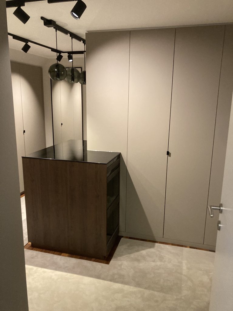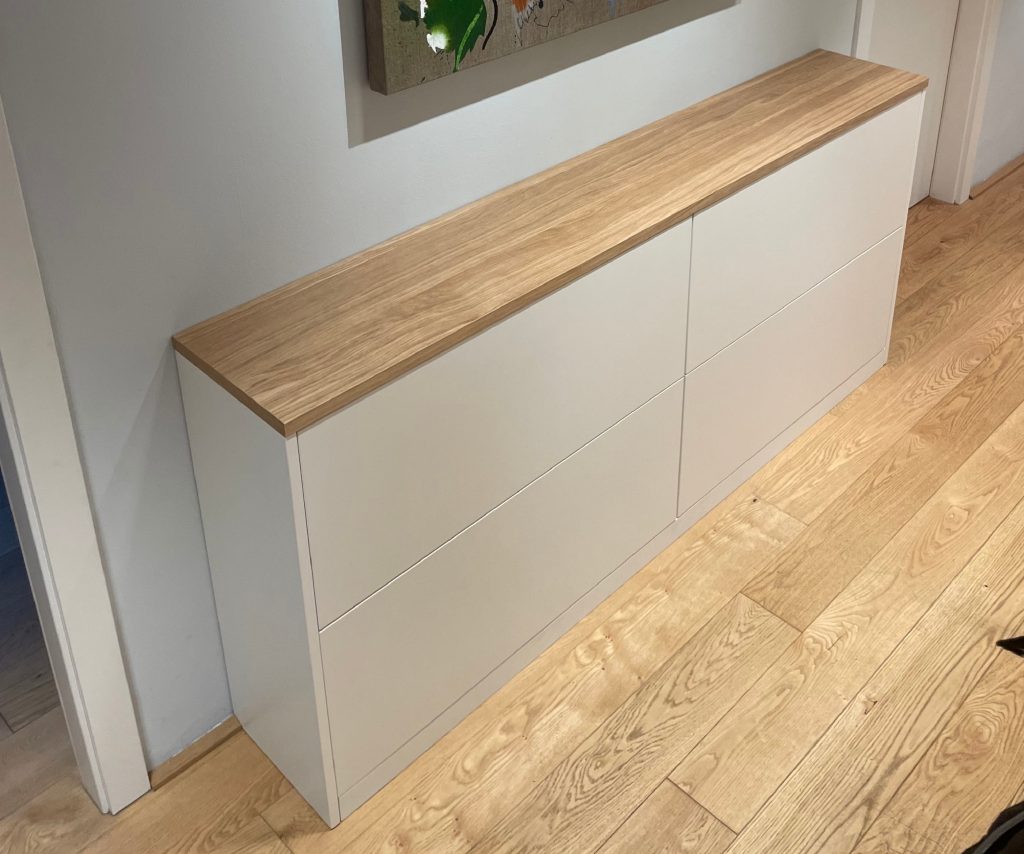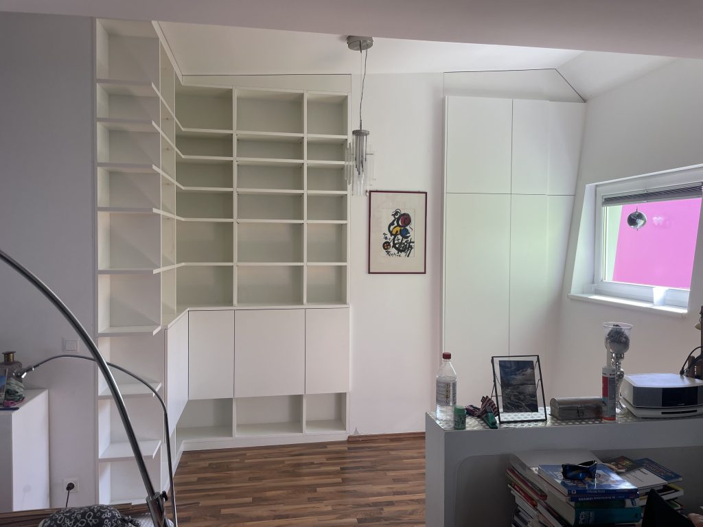 Eleganter Home-Office-Wandschrank mit integrierter Schreibtischfunktion, individuell nach Kundenwunsch geplant und mit hochwertigen Beschlägen ausgestattet.