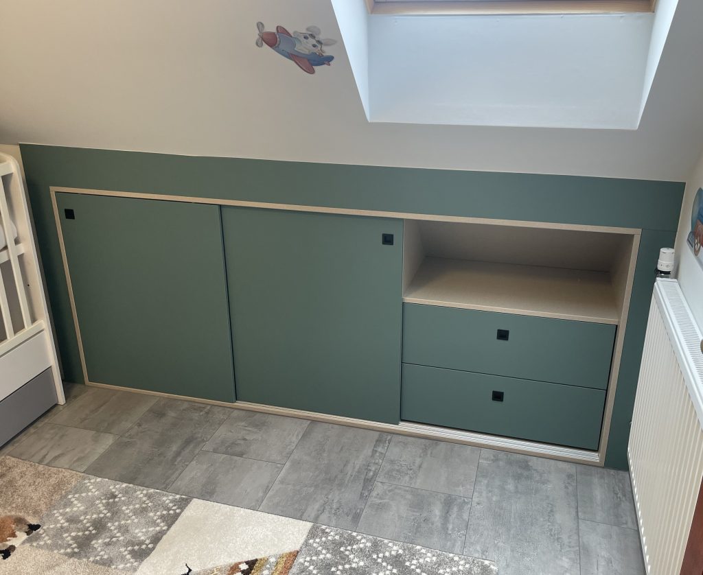 Individuelle Kinderzimmermöbel mit textilbeigem Korpus, grün matten Schiebetüren und extra tiefen Laden – perfekt eingebaut unter der Dachschräge.