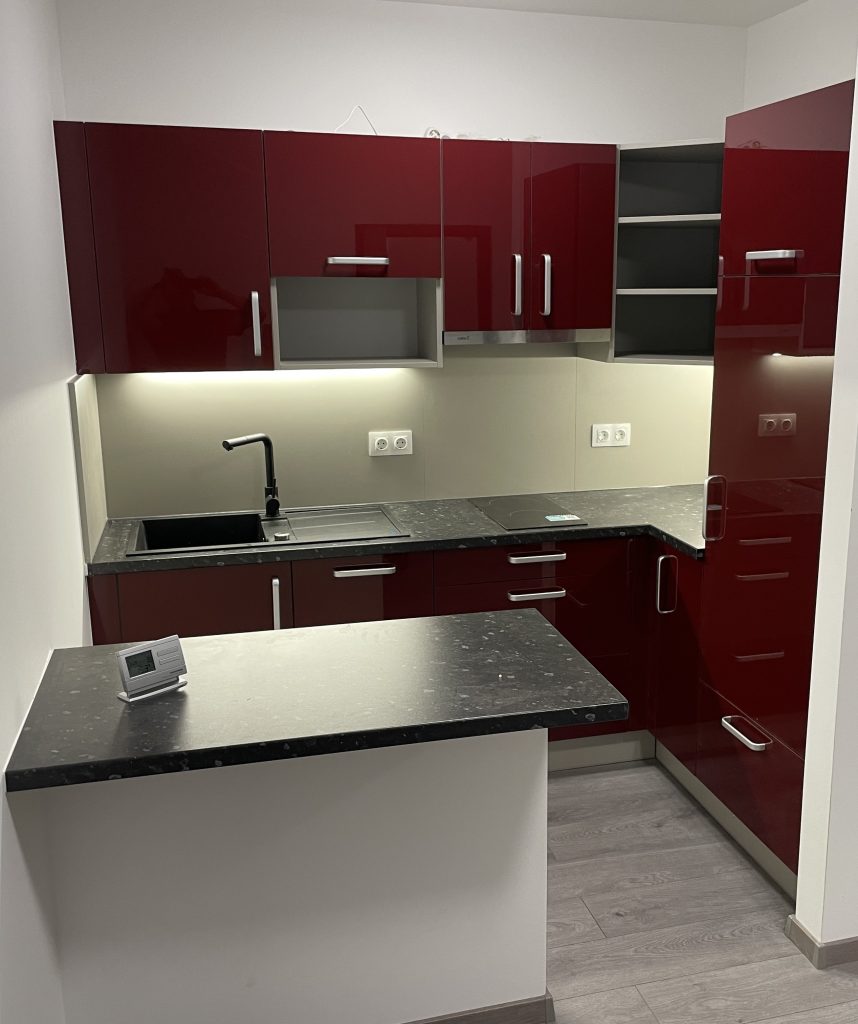 Einbauküche mit hochglänzenden, burgunderroten Fronten, hellgrauen Schrankkorpussen sowie schwarzem Waschbecken, Wasserhahn und Schubladen. Für alle, die kräftige Farben lieben.