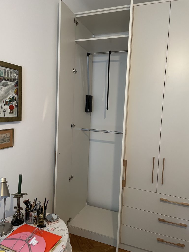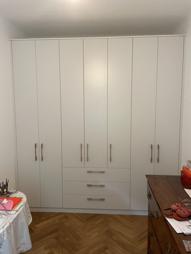 Symmetrische, weiße Garderobe mit Holzgriffen und Kleiderlift.